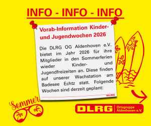 Jetzt vormerken: Die Kinder- und Jugendwochen 2026 finden wieder, für unsere Mitglieder, an unserer Wachstation am Badesee Echtz statt! Die Termine: